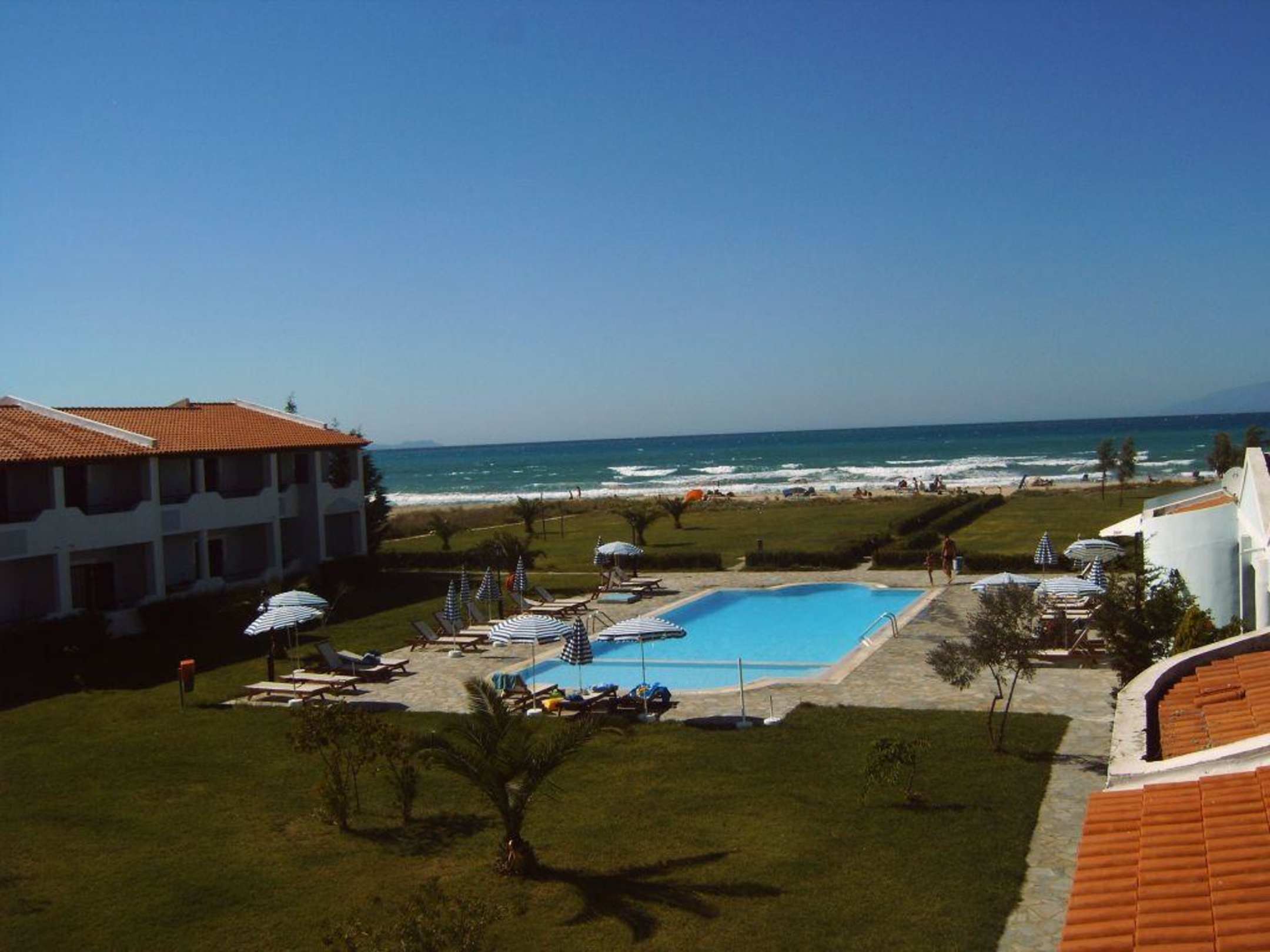 Blick von der Dachterasse des Gelina Mare auf Pool und Meer