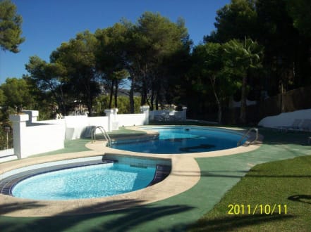 Pool von der anderen Seite aus gesehen. Das vordere kleine Becken ist gerade oberschenkeltief und hat rundum eine Kante unter Wasser um darauf zu sitzen.