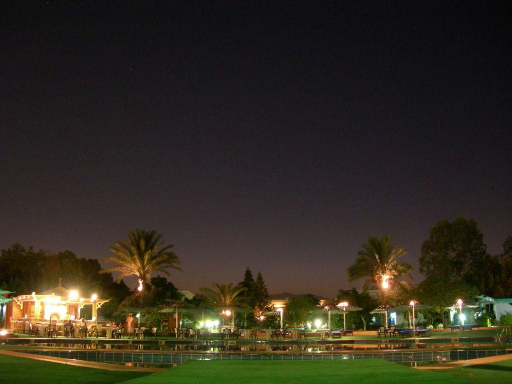 Nachtaufnahme der Poollandschaft udn den darum angeordneten Bungalows