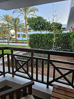 Aussicht vom Balkon auf die Gartenanlage.