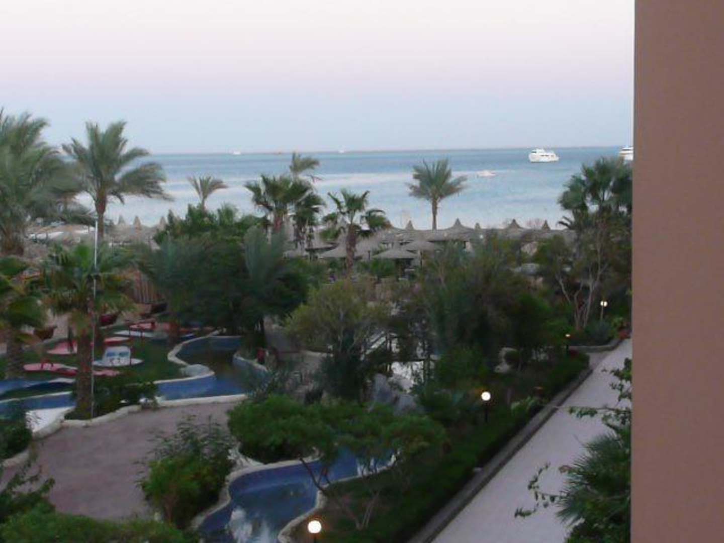 Blick vom T-Block auf die Gartenanlage und Meer