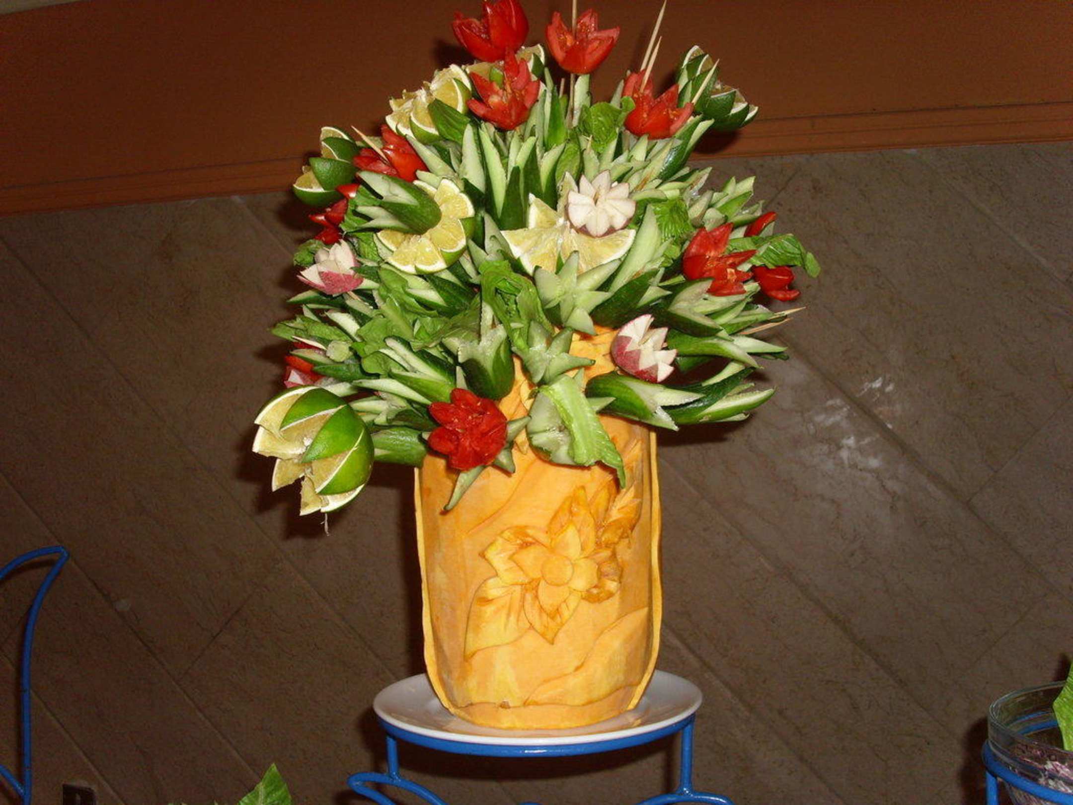 Hauptrestaurantsehr schöner Strauß, aber nicht aus Blumen, sondern aus Obst und Gemüse dekorieren das Bufet