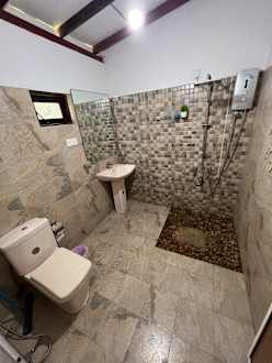 Badezimmer, die Steine in der Duschwanne sind ein zweifelhaftes Vergnügen.