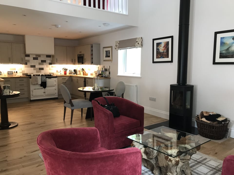 Wohnzimmer mit Küche im Hintergrund