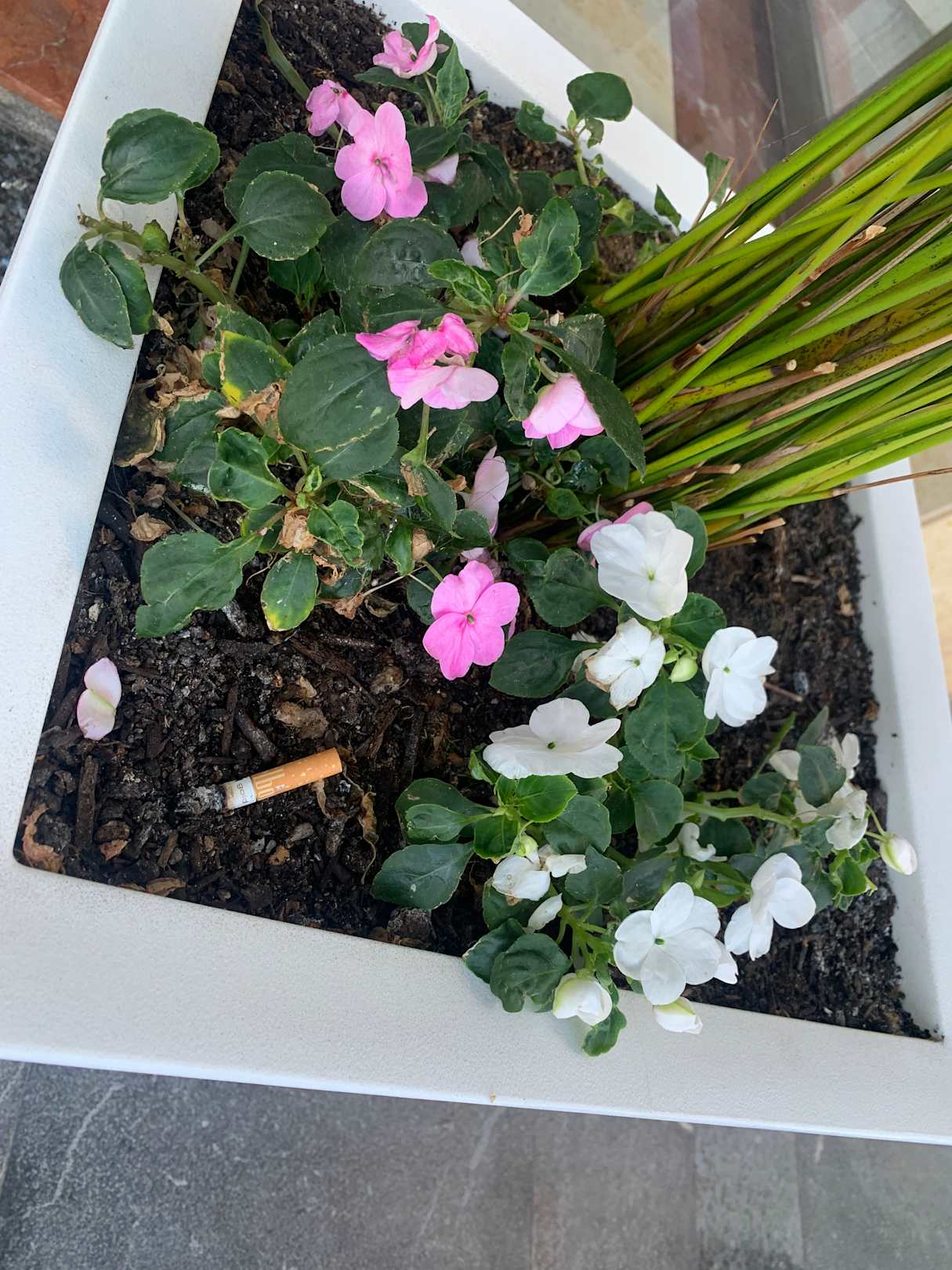 GartenanlageDas ist nur ein Foto von wenigen .. kippen im Eingangsbereich in den Pflanzen , vertrocknete Blumen die nicht gegossen werden .