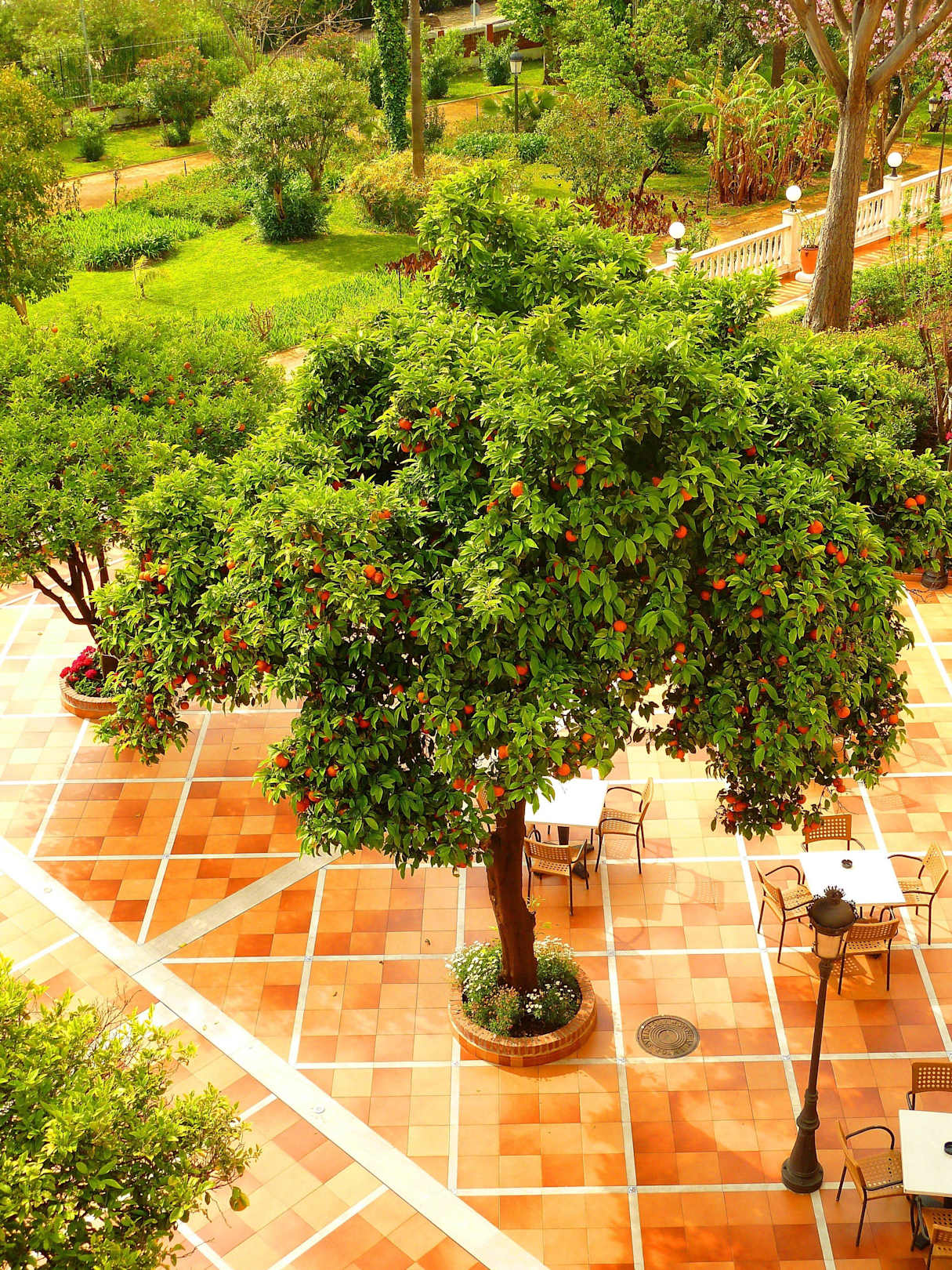 Blick auf einen Orangenbaum unter dem Zimmer
