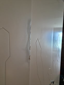 Beschädigte und notdürftig reparierte Schranktüren