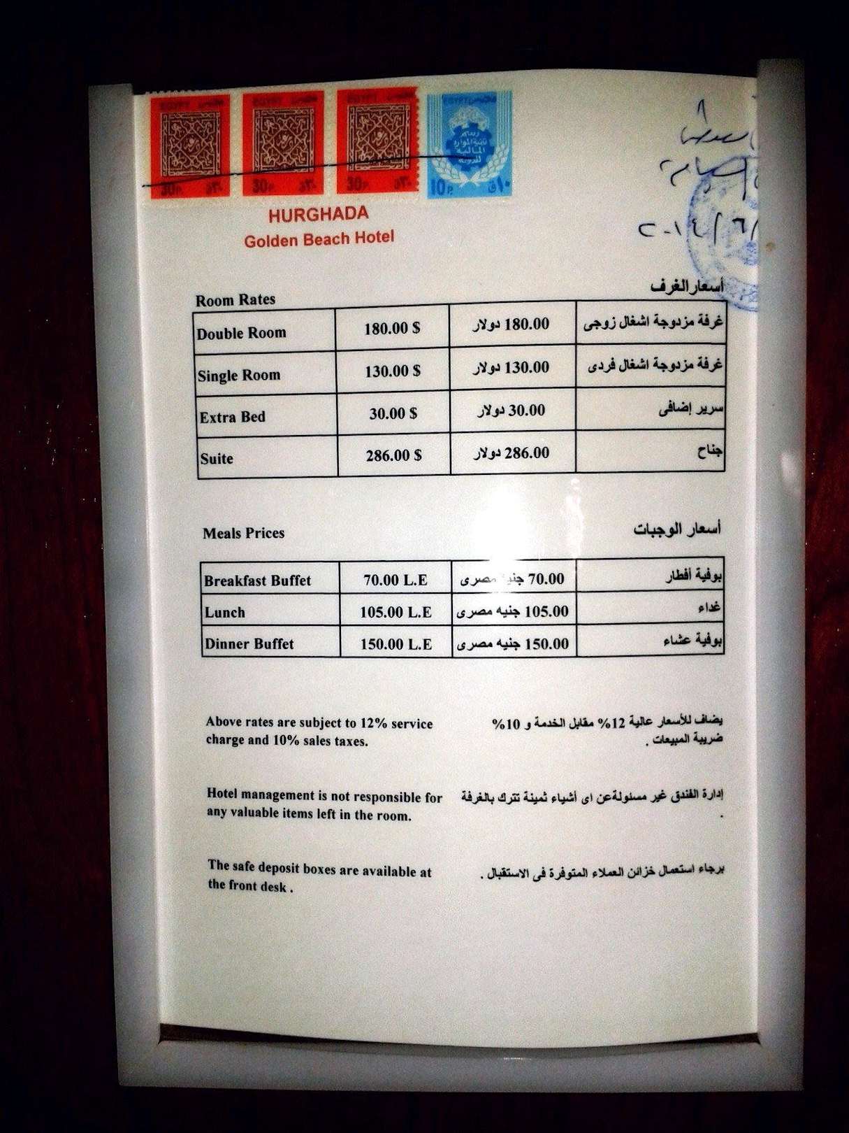 Preisliste an der Zimmertür