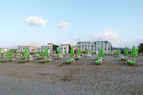 Strand, Liegen und Hotel vom Strand