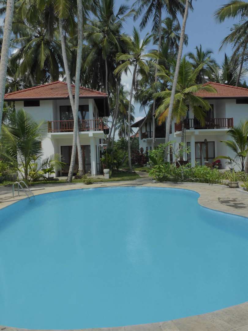 Sauberer Pool mit Villen im Hintergrund