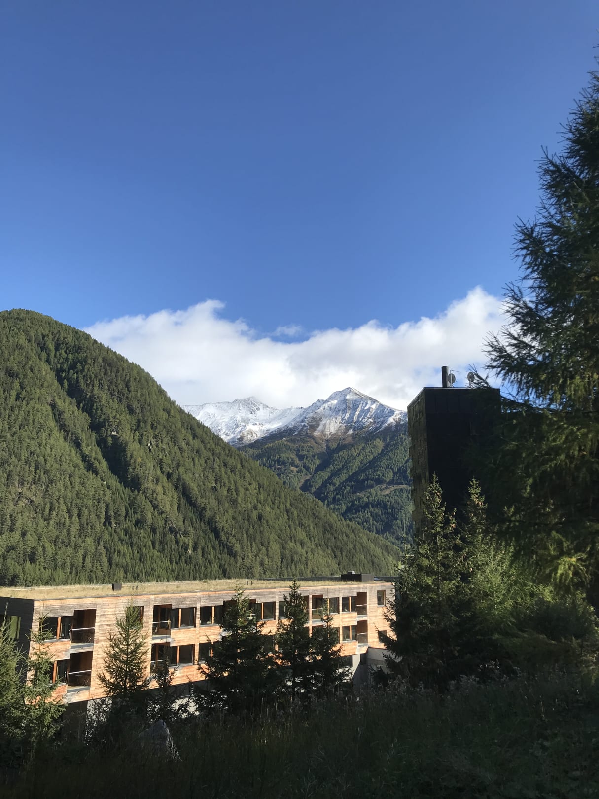 Blick von hinterm Hotel aufs Hotel und die Berge gegenüber