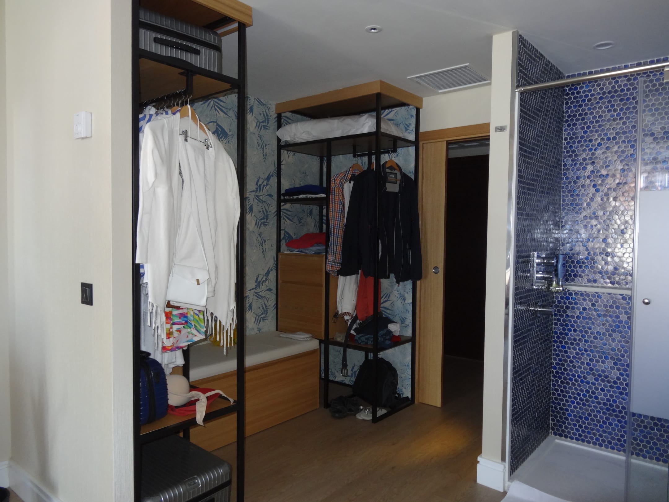 Der offene Kleiderschrank, aber mit Bügelbrett und Bügeleisen. Nur wer bügelt denn im Urlaub??