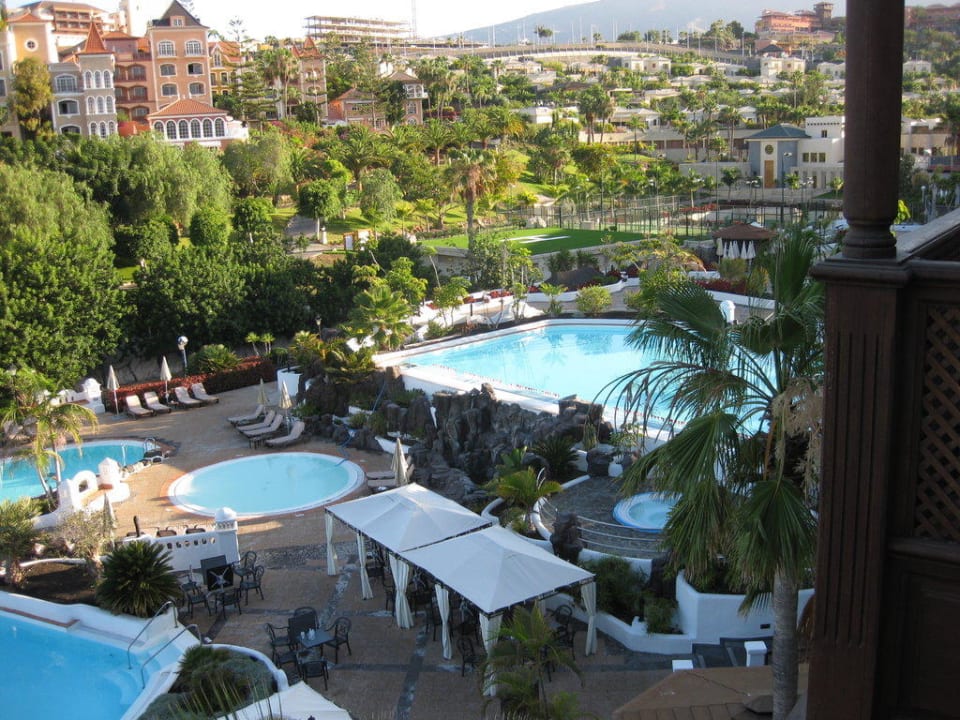 Ausblick vom Balkon zu den Pools