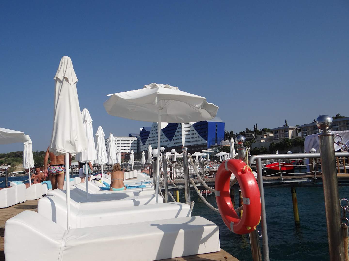 Steg mit Liegen und Schirmen