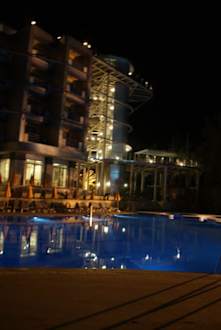 nachtfoto van hotel en zwembad