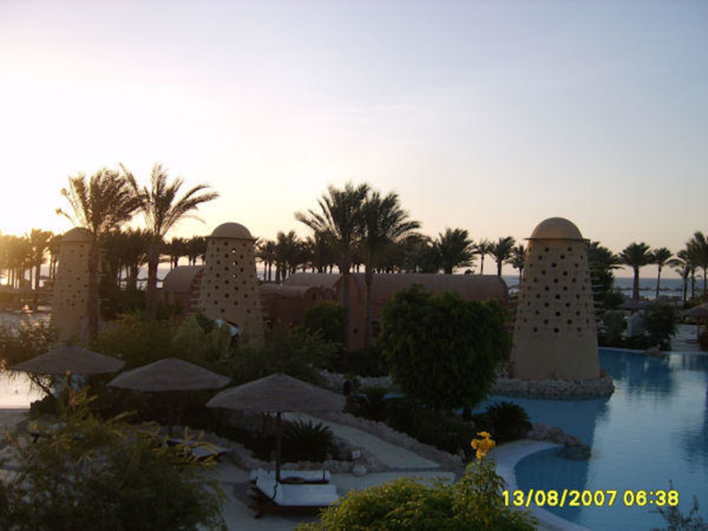 Grand Makadi... der Tag erwacht. Im Vordergrund sind die Taubentürme zu sehen. Bereits bekannt durch viele Fotos im Reisekatalog.