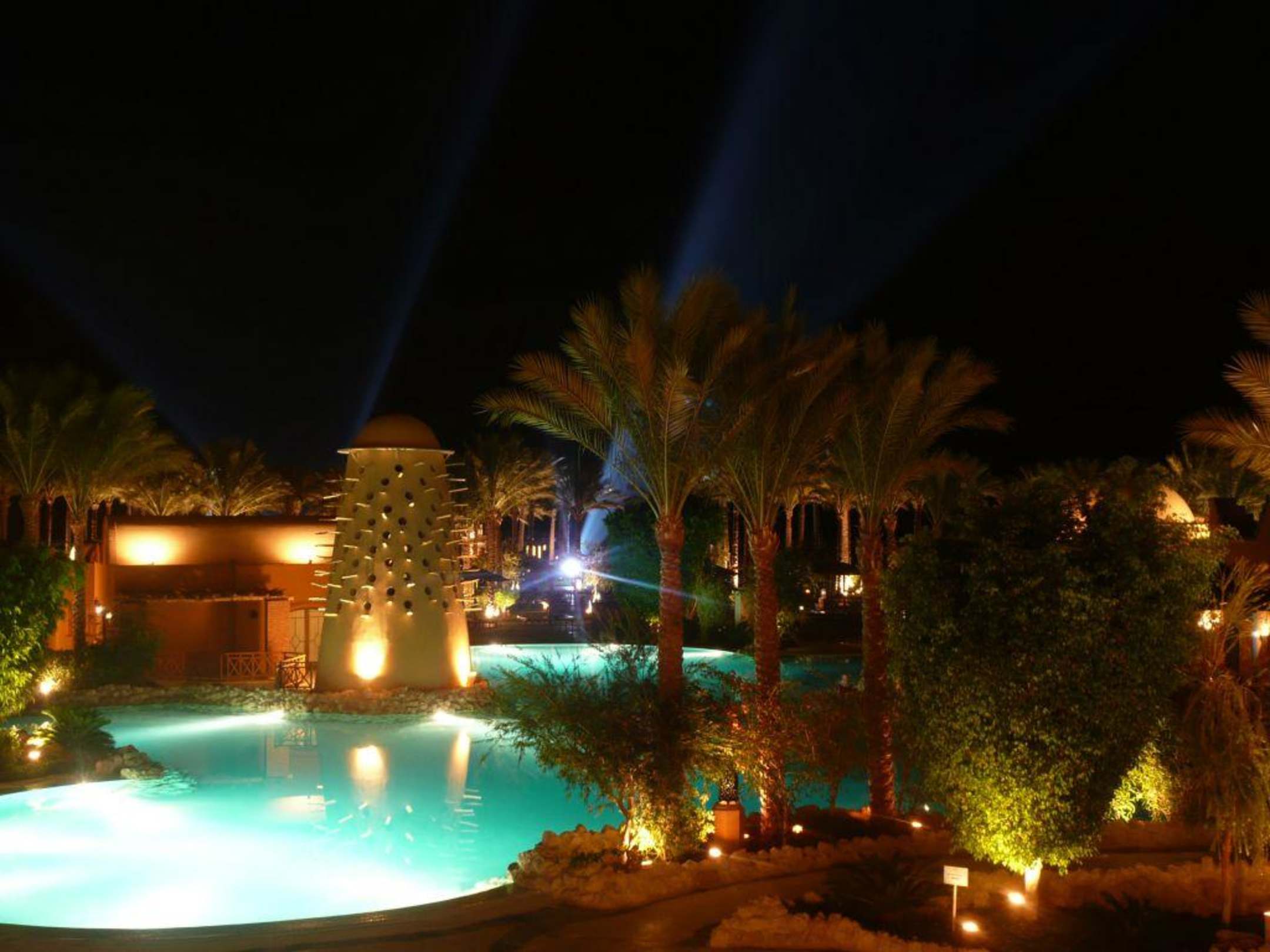 bei NachtBlick auf den Pool Richtung Strand - Einen Abend in der Woche wurde eine Stranddisco mit Show angeboten