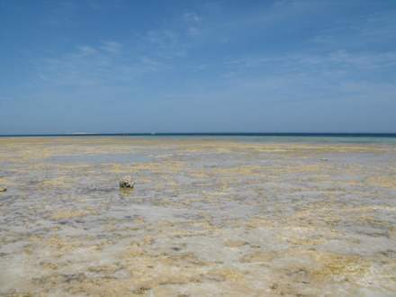 Strand bei Ebbe: Riff im flachen Wasser leider abgestorben