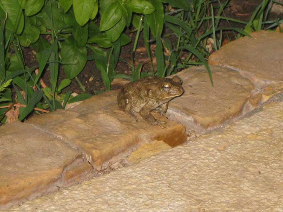 Viele Frösche rund um den Pool quacken am Abend