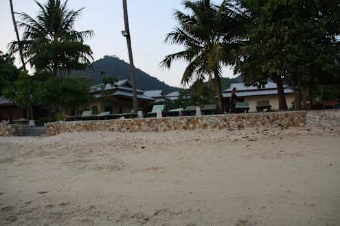 Blick vom Strand auf den Liegebereich und Poolbar