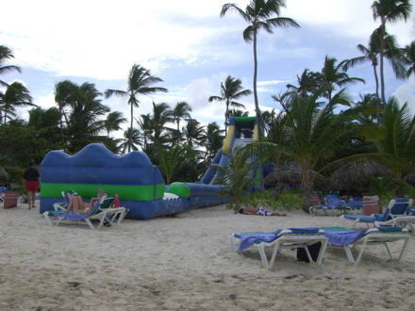 Der Strand in der Mittagszeit: Die Liegen sind alle vorreserviert, aber keiner liegt drauf. Wenn man richtig hinsieht, erkennt man neben der Rutsche jemanden im San liegen. Der ist wohl morgens zu spät aufgestanden.