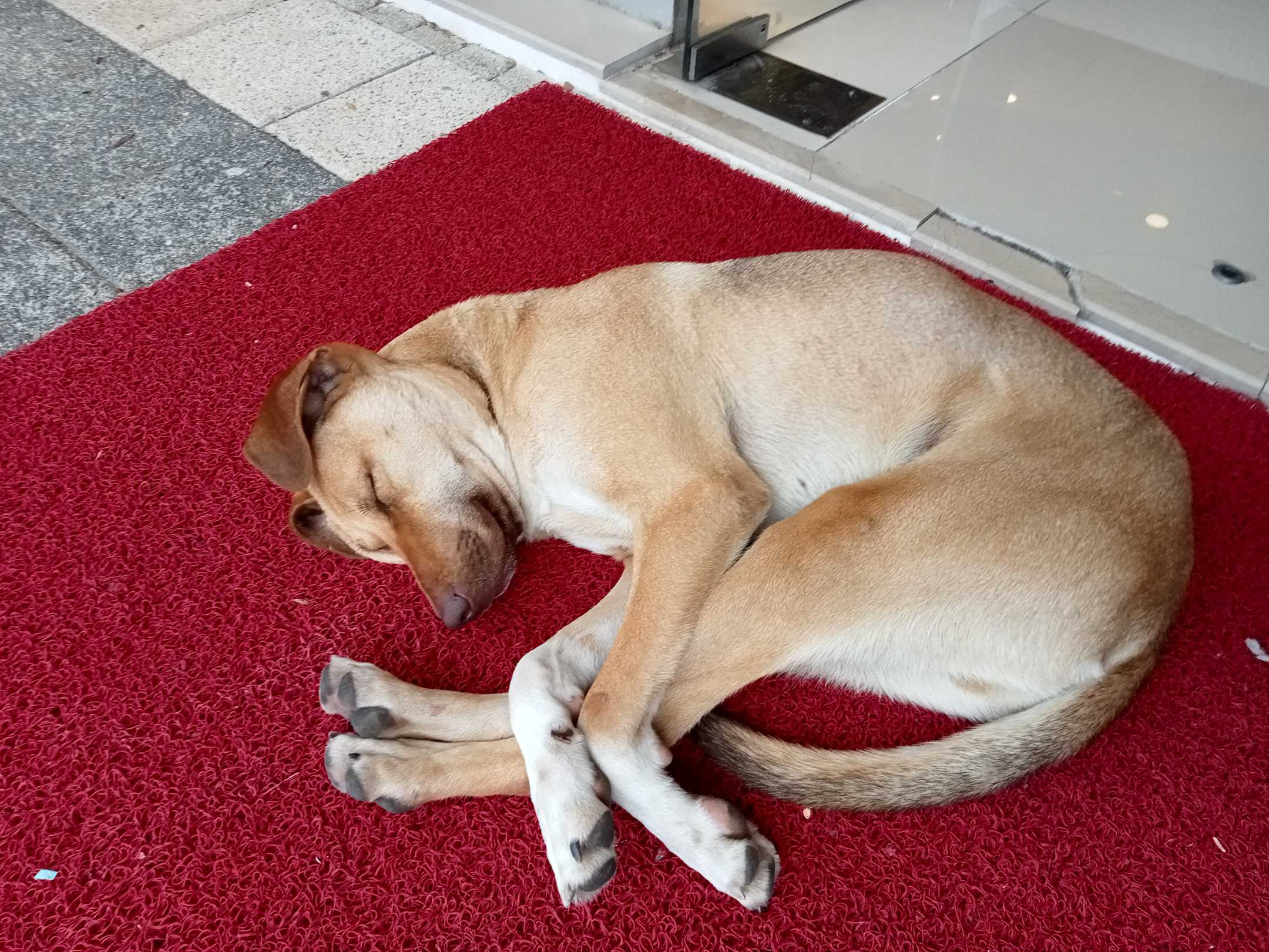Wachhund vorm Geschäft in der Ladenzeile gegenüber