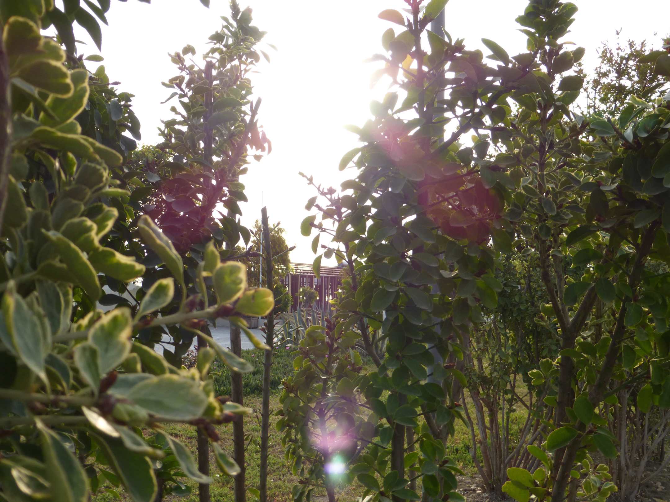 Blick durch blühende Sträucher am Stand