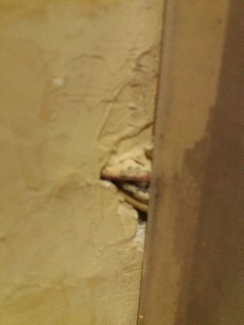 Freiliegende Leitungen im Bereich der Badewanne im Familienzimmer.