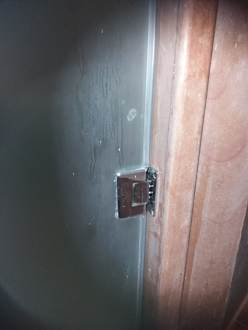 ZimmerBadezimmer. Frisch geputzt bei der Anreise. Man beachte den Dreck an den Scheiben. Das Scharnier ist nochmal extra fotografiert.