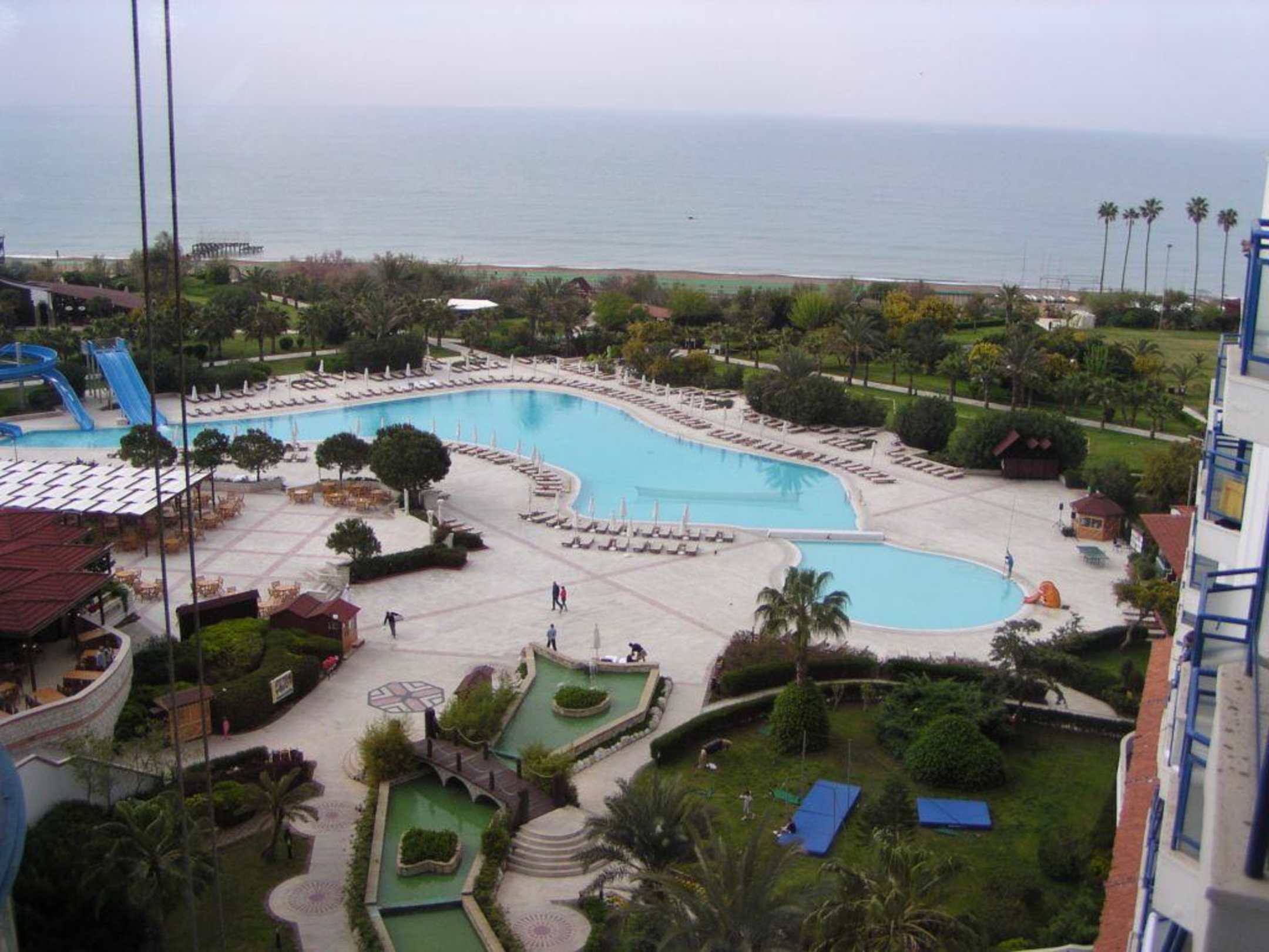 Hotelanlage aus dem 7. StockSchöner Ausblick über die riesige Anlage, vorne rechts neben dem Kinderpool ist der Mungo Club, dahinter der Relaxpool (nicht sichtbar), die Gartenanlage und der Strand. Dort wo die Palmen sind ist die Wassersportausgabe. Vorne links ein Teil des Restaurants, dahinter die tollen Rutschen und weiter hinten das Außen-Restaurant. Tipp: Alle Restaurants einmal ausprobieren, das Zapata und Basta Pasta mittags und abends Milanese (italienisch), La Brise (Fisch!) und La Careta (lateinamerikanisch).