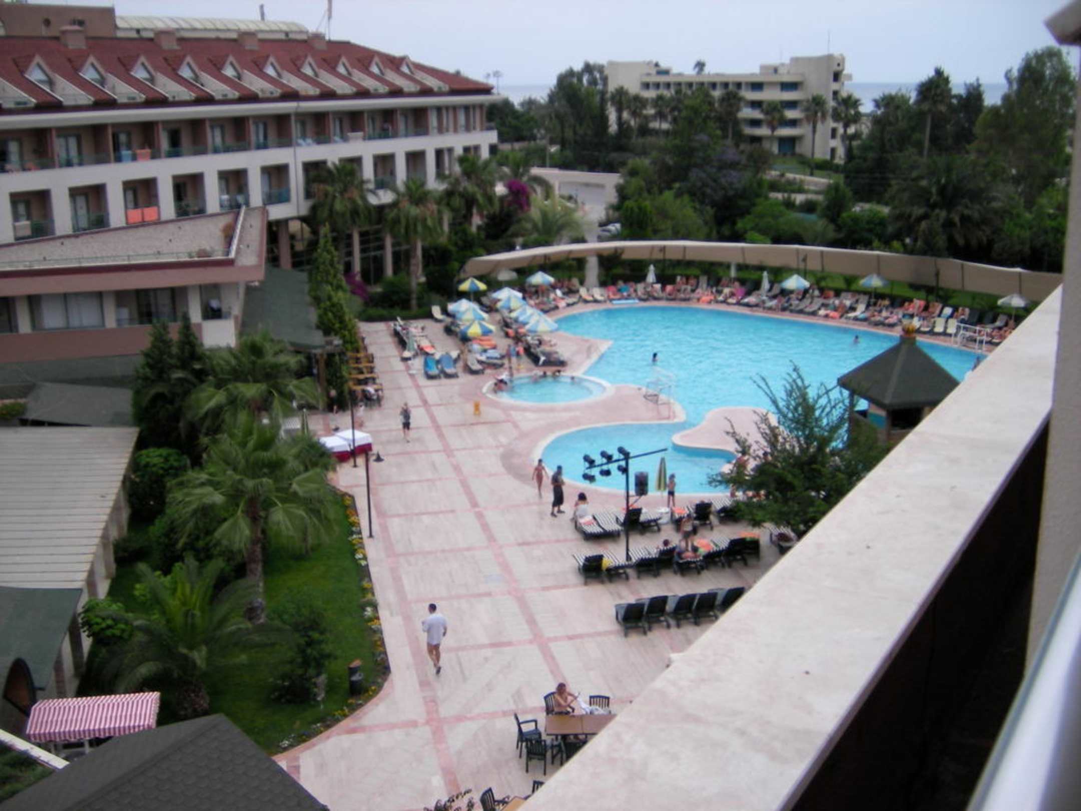 Blick vom Zimmer des Neugebauten Hotelblocks auf das Meer und den Poolbereich