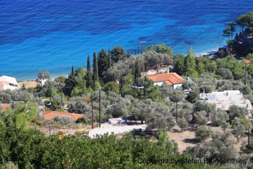 Hier wird das Anwesen von oberhalb des Hanges hinter dem Anwesen gezeigt: Rechts das Haus mit den Apartments, in der Mitte und links die Gebäude mit den Studios und unterhalb der Lemonakia-Strand.