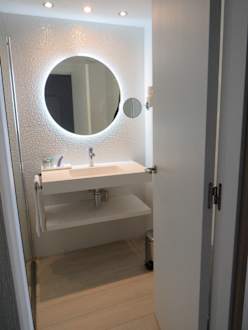 ZimmerZimmer 2, Hauptgebäude Badezimmer bei Licht an.