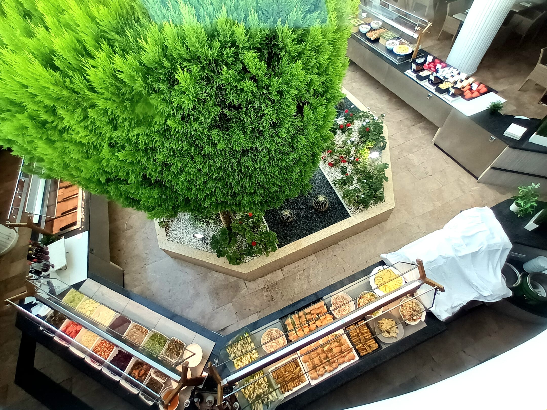 Das Buffet von oben durch die Glaskuppel