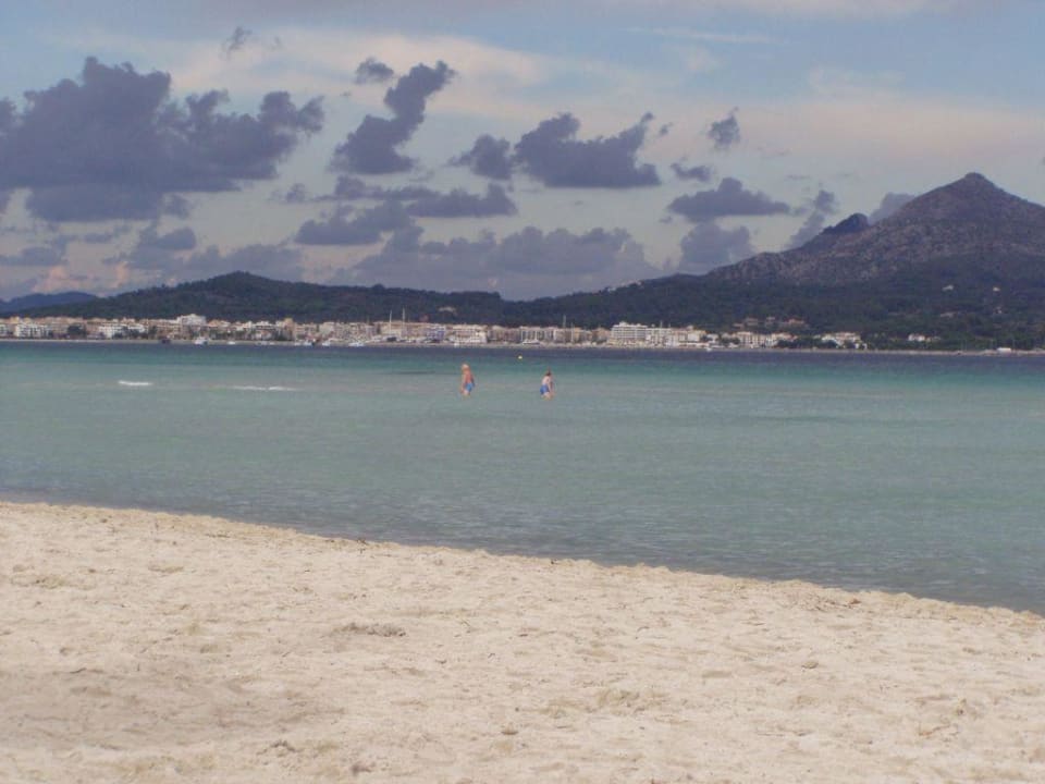 Strandabschnitt vor dem Hotel: weißer Sand, klares Wasser.