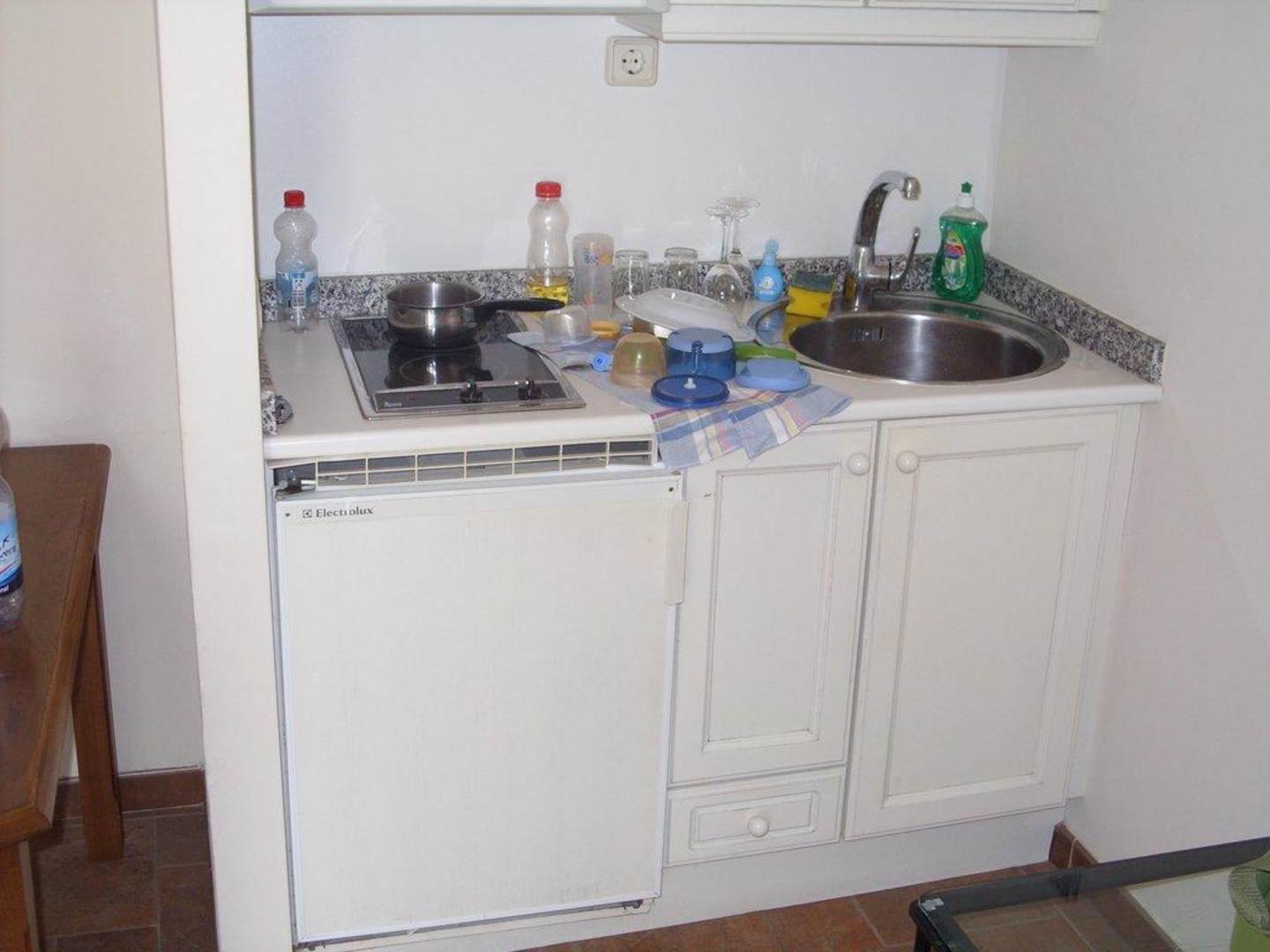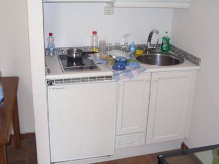 KitchenetteAlte Küche. Vor allem der Kühlschrank war eine Katastrophe. Der war weder fest montiert, noch war das Schutzgitter darüber noch ok.