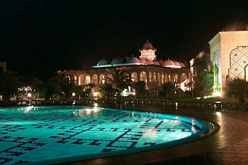 Poolbeleuchtung bei Nacht im AliBey Belek; im Hintergrund das Hauptrestaurant, rechts schließt sich das Shopping-Gebäude an;