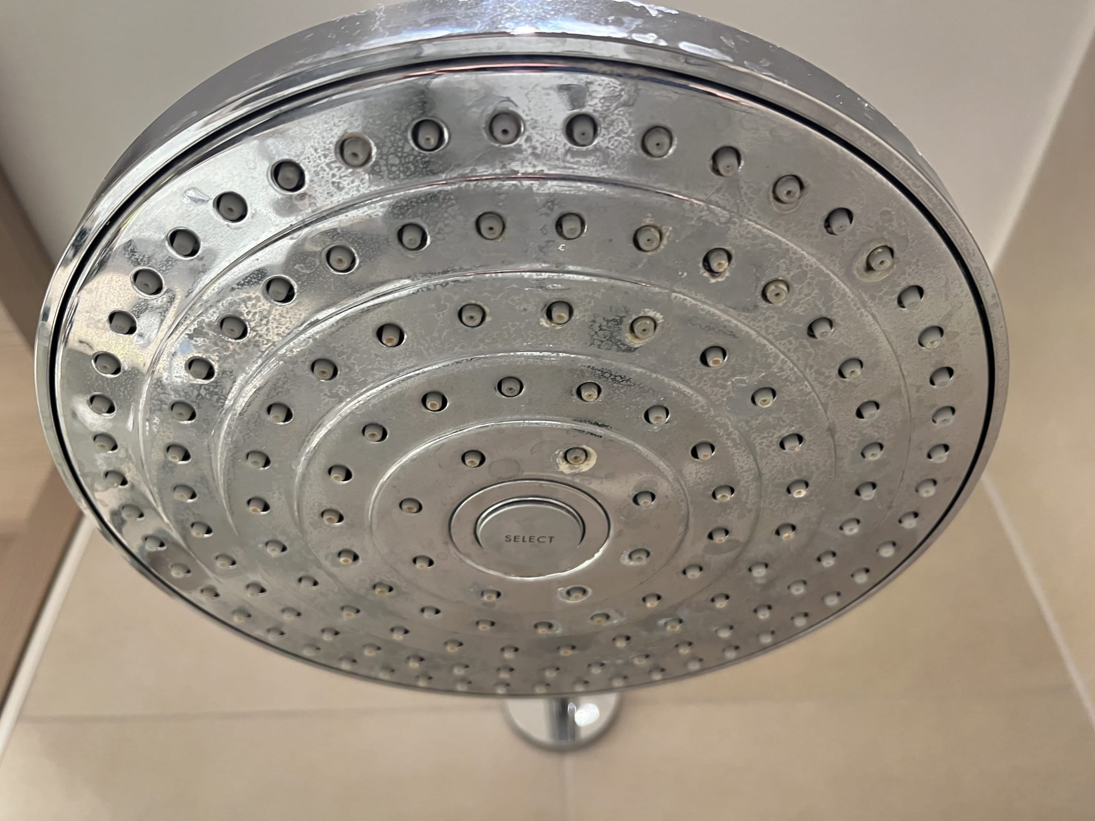 Besagte Reinigungsdefizite im Bad, hier: der verkalkte Duschkopf.