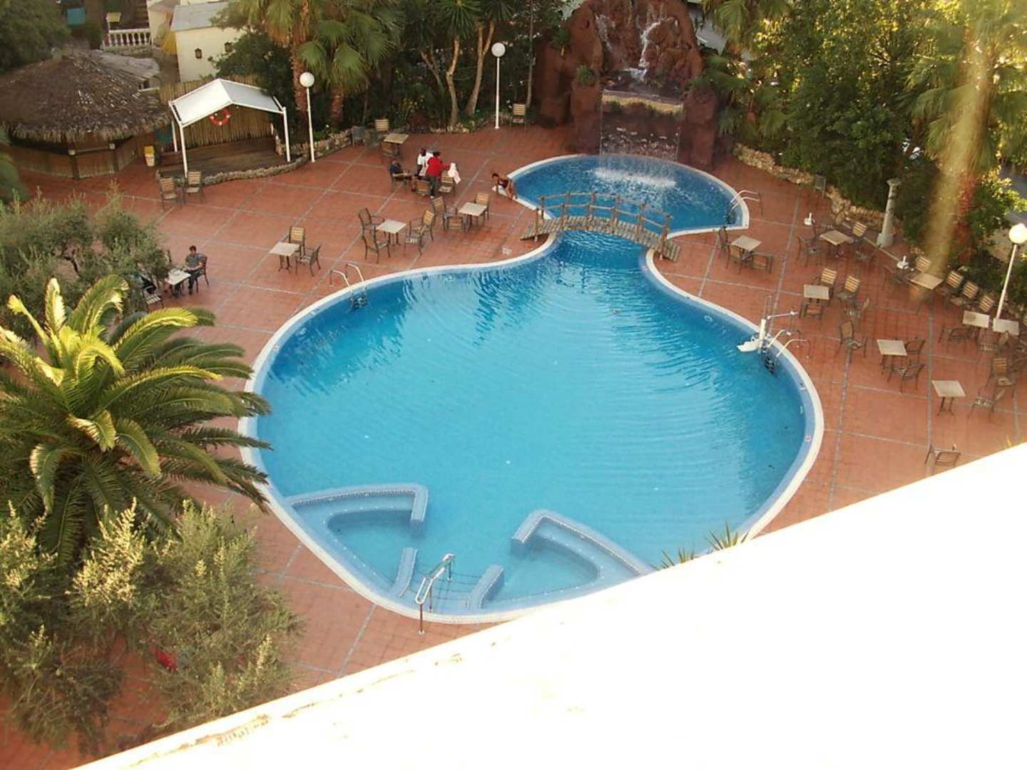 Renovierter Außenbereich ,Pool in Fischform mit einem kleinen Wasserfall.