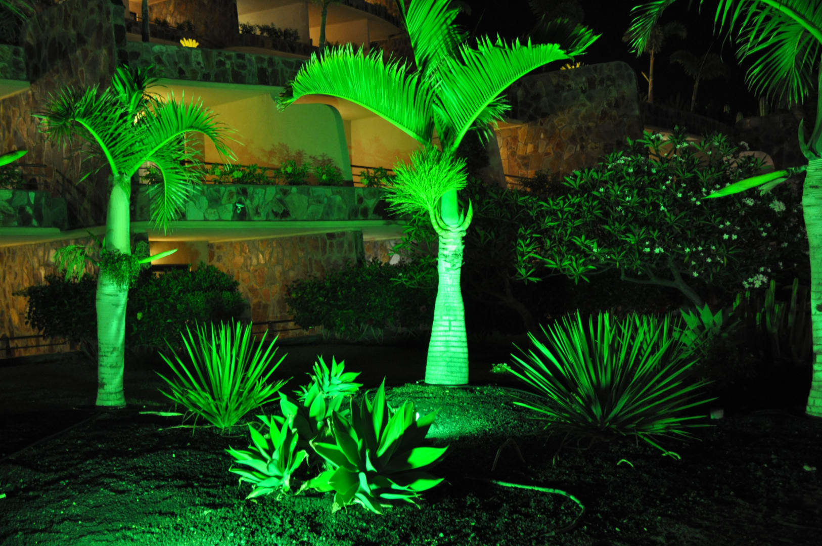 Gartenanlage bei Nacht.
