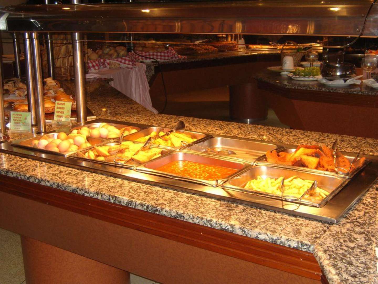 Theke mit Eiern, geröstetem Toastbrot, dicken Bohnen usw.