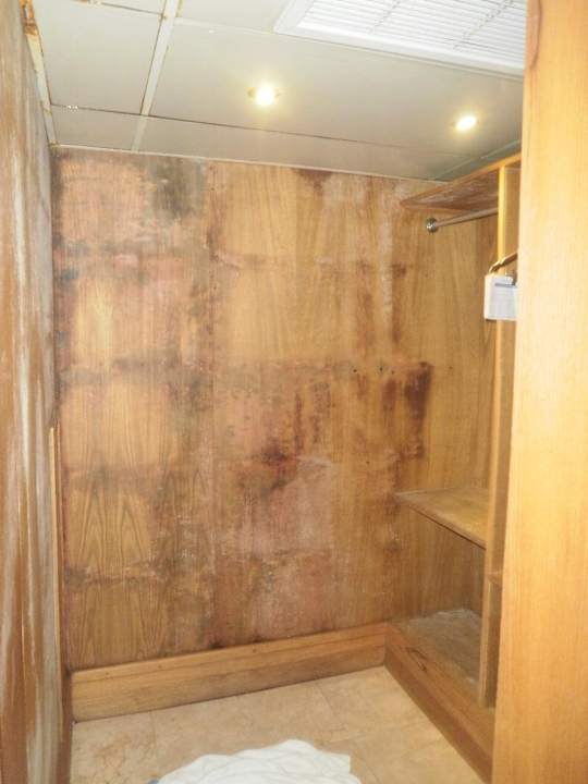 Hier topft das Wasser der Klimaanlage von der Decke auf den Boden. Die Wände sind aus Holz und saugen sich mit Wasser voll. Hier sollte man die sauberen Kleider aufbewaren! Es ist alles feucht und stinkt modrig.