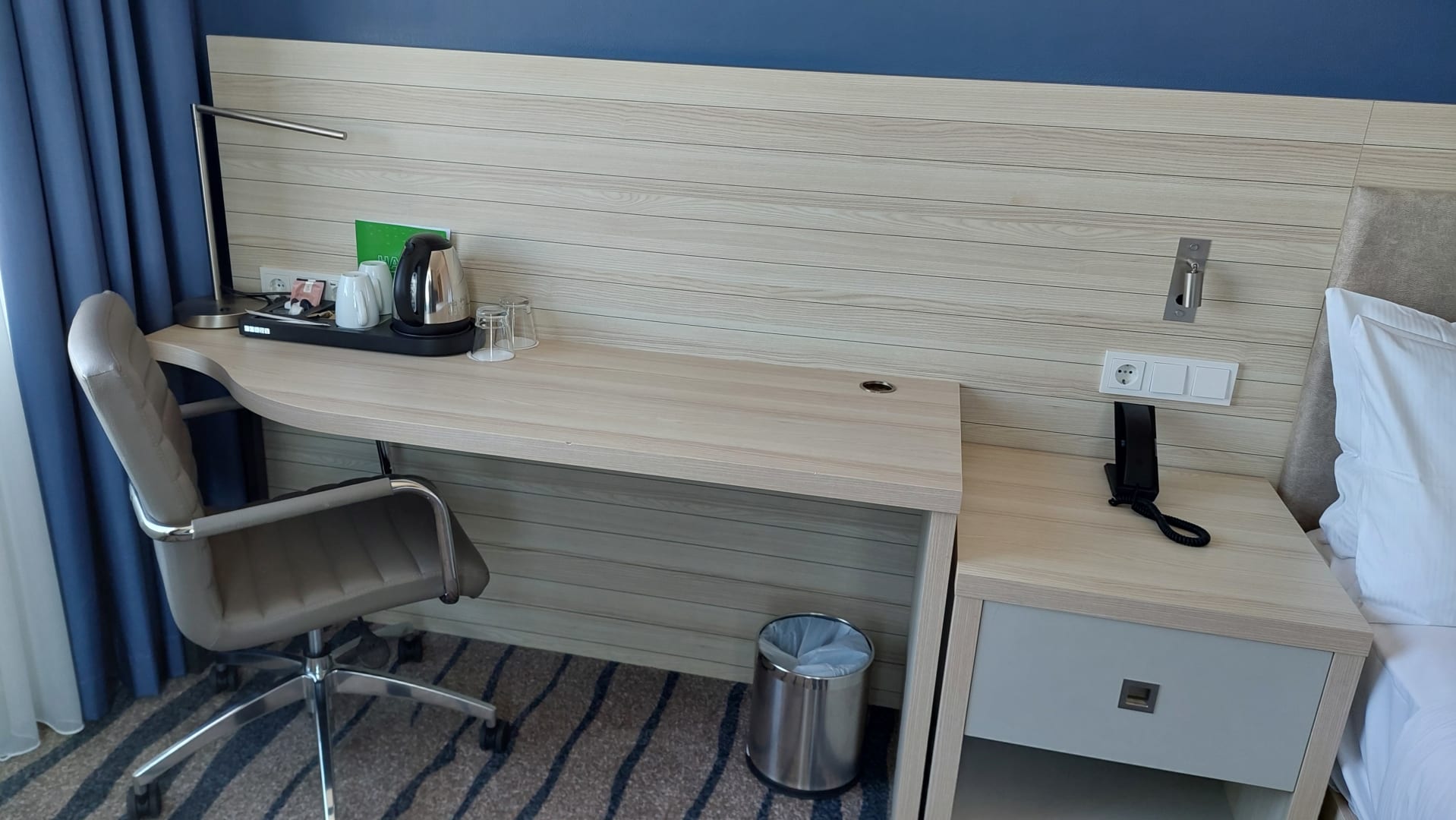 Arbeitsbereich mit Wasserkocher, Tassen und Gläser
