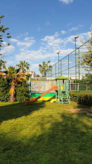 Das Trampolin und eine kleine Rutsche.