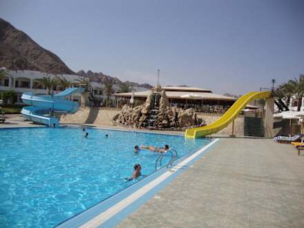Hier sieht man den mittleren Pool, hier mit 2 Rutschen und nebenan ist noch ein kleinerer Pool wo auch die Kinderanimation stattfindet.