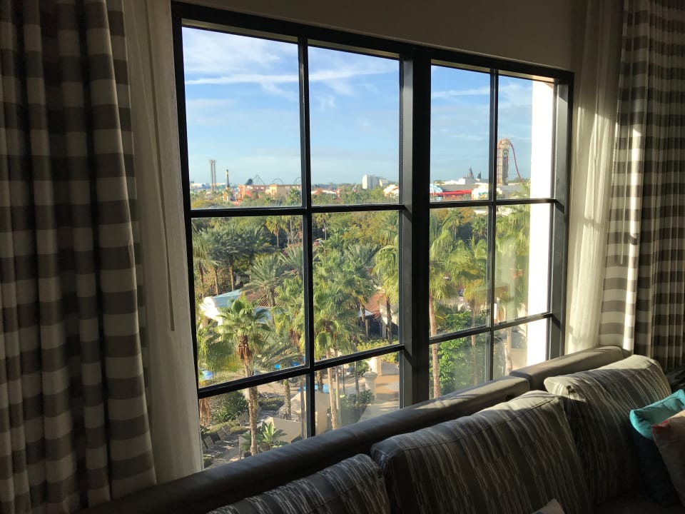 Blick aus dem Fenster, über den Pool hinweg sieht man die Parks