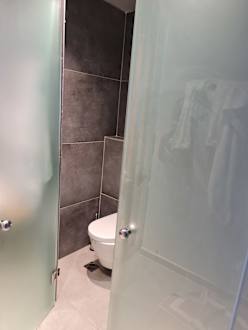 Toilette sehr beengt. Etwas größere Leute müssen die Türe offen lassen. Rechts daneben, die Dusche.
