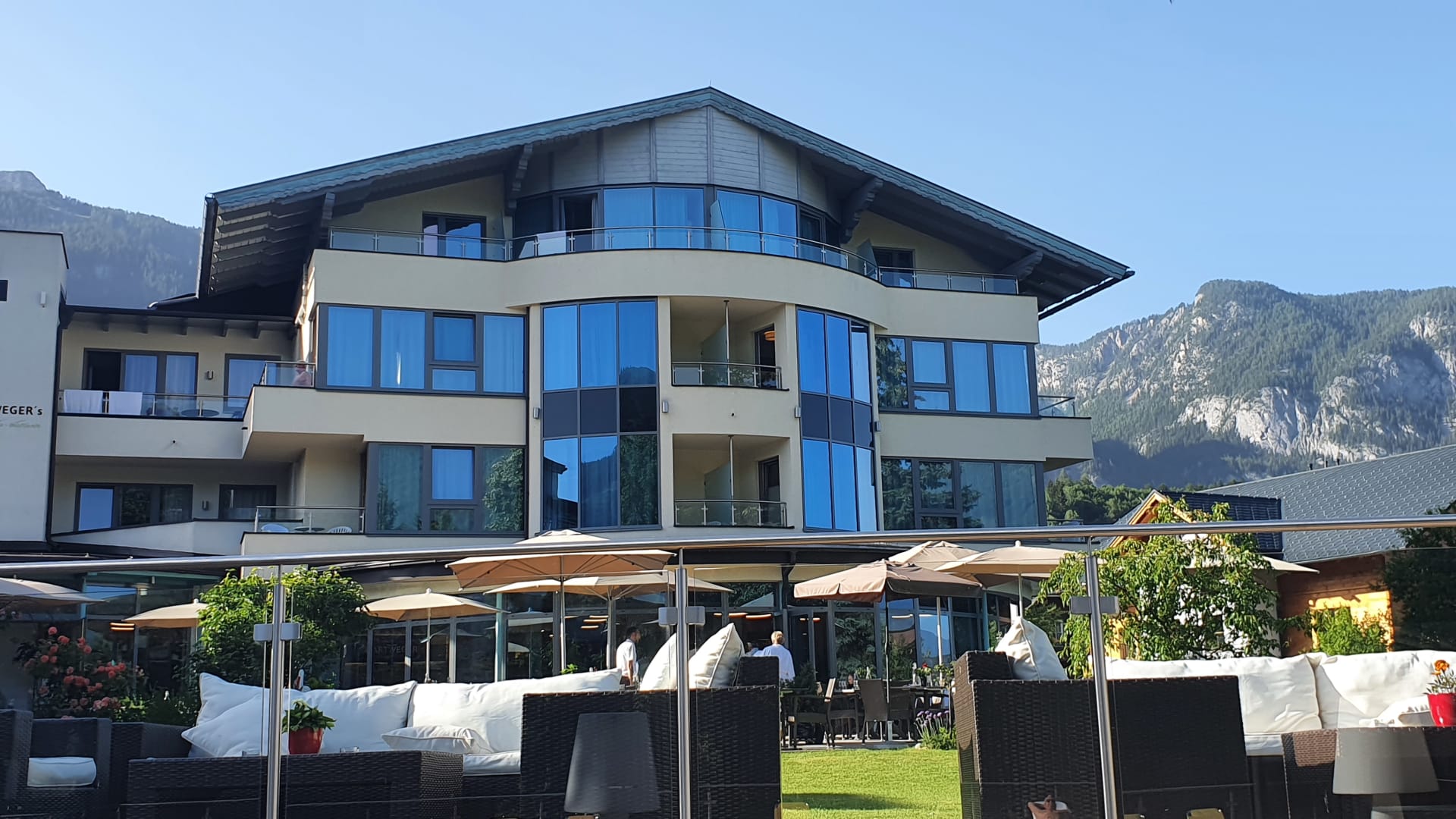 Außenansicht vom Garten aus. Wir hatten das Zimmer im 2.OG Mitte, rechts mit dem sehr kleinen Balkon
