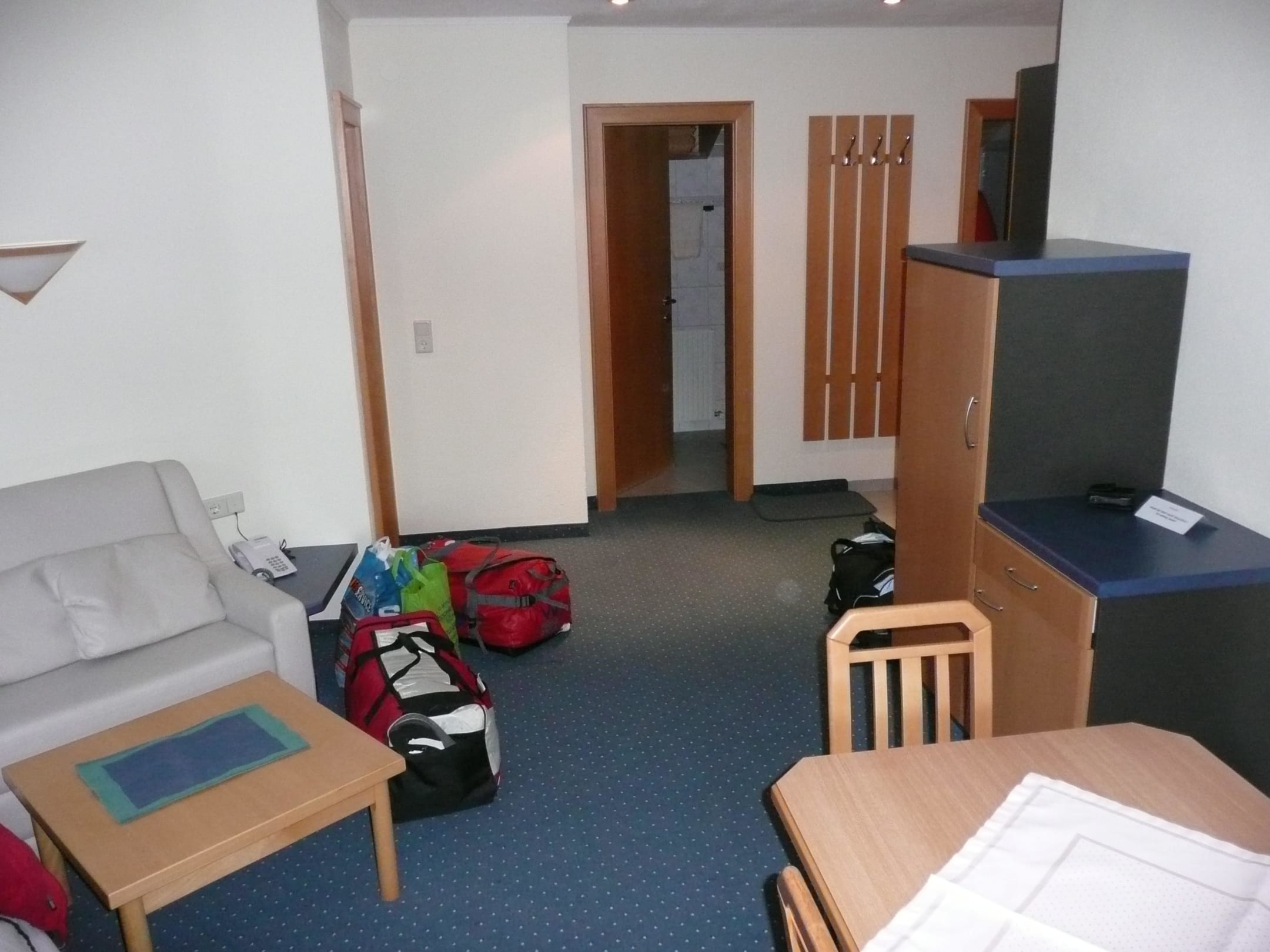 WohnbereichBlick von der Balkontür aus´, links Schlafcouch, rechts Tisch, vorne links Eingang Schlafzimmer, gradeaus Badezimmer, vorne rechts Küchenzeile/Eingang