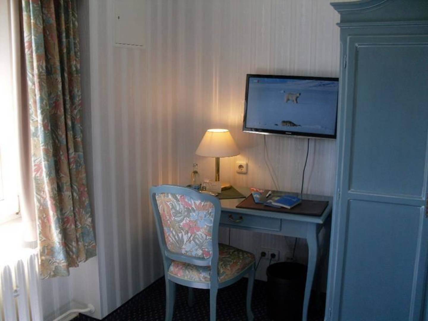 Schreibtisch mit Stuhl, Flachbildfernseher, Tischlampe und Schrank.